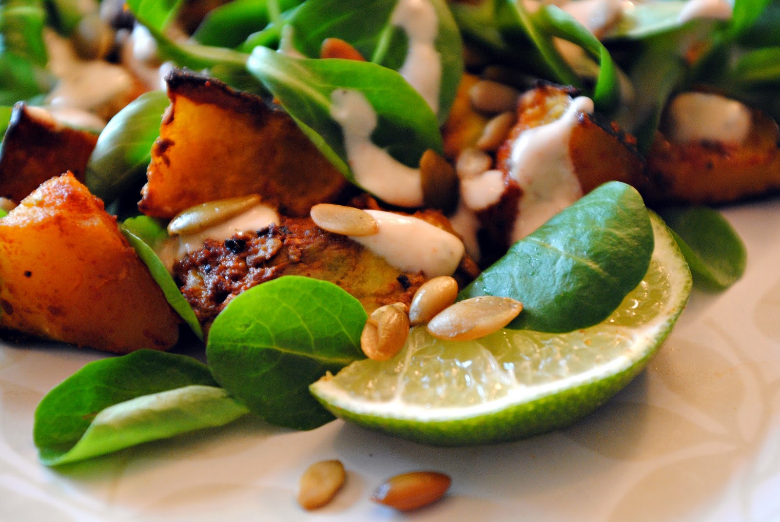 Roasted acorn squash and avocado salad, yogurt lime dressing